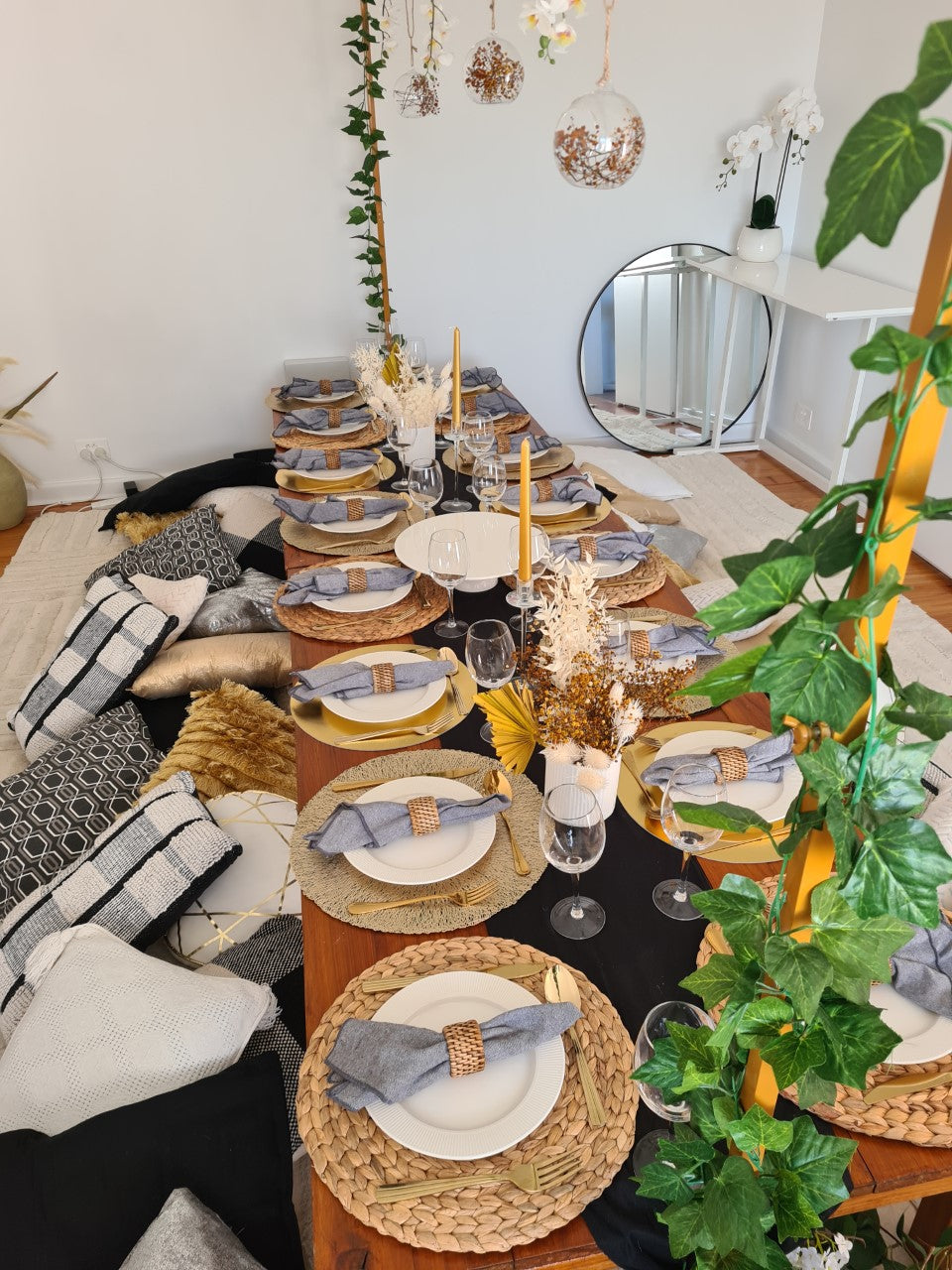 Table setting: Medium white ceramic plates, gold cutlery, black table runner, gold and water hyacinth placemats, grey linen napkins and glassware: including wine or sparkling glasses = $5 per person (up 20 people)