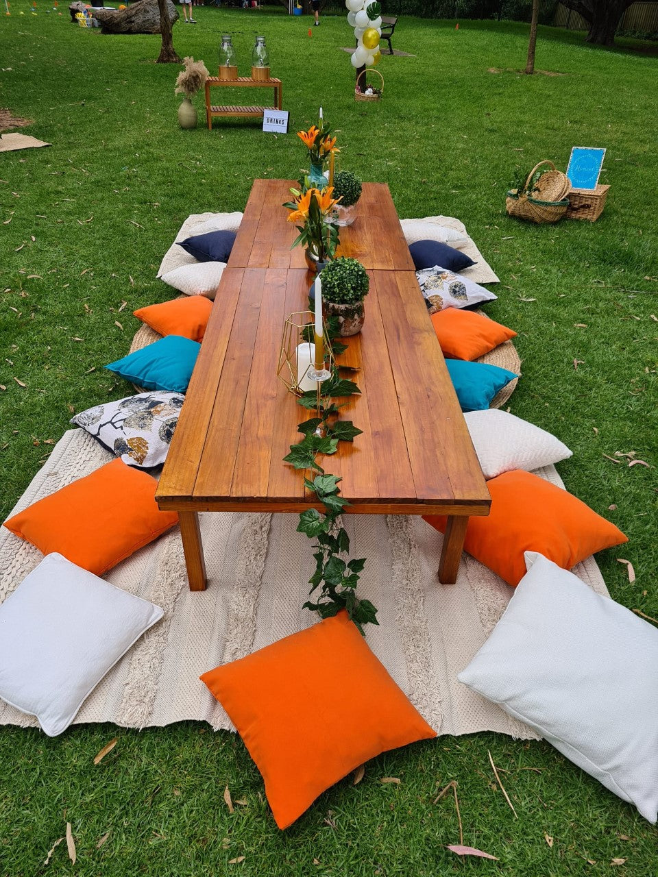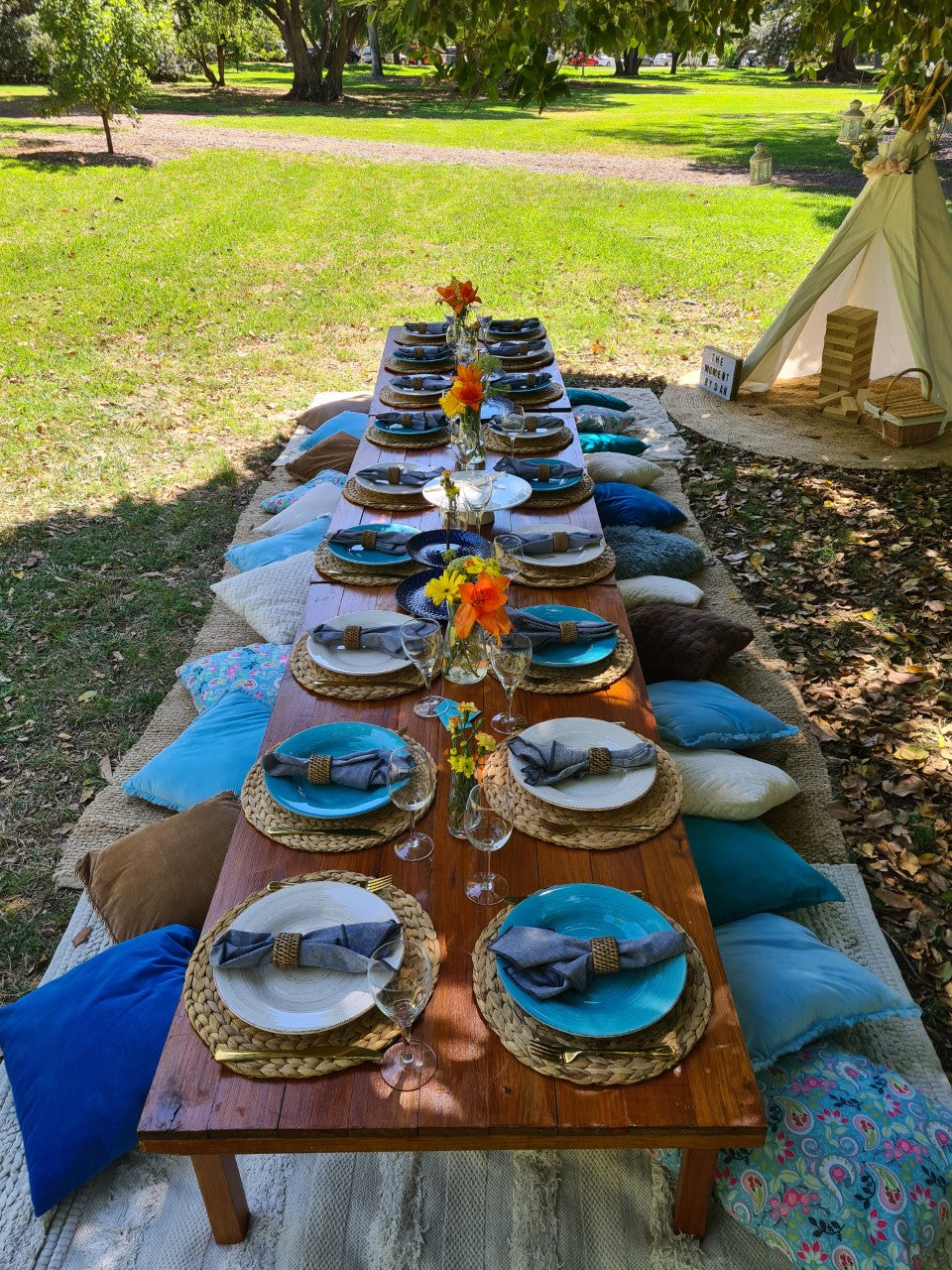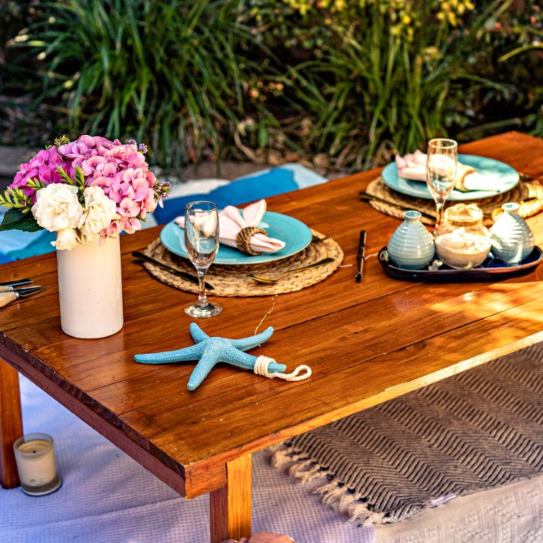 Table setting: Mix of blue turquoise and brown ceramic dinner plates, gold cutlery, water hyacinth placemat or table runner, blue/grey linen napkins and glassware: including wine or sparkling glasses = $5 per person (up 20 people)