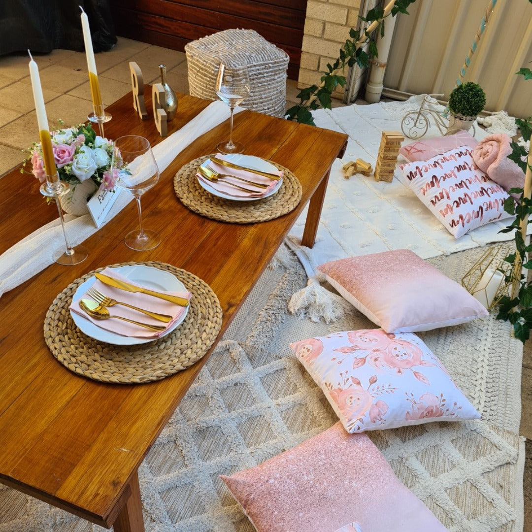 Table setting: Medium white ceramic plates, gold cutlery, water hyacinth placemat, pink linen napkins and glassware: including wine or sparkling glasses = $5 per person (up 20 people)