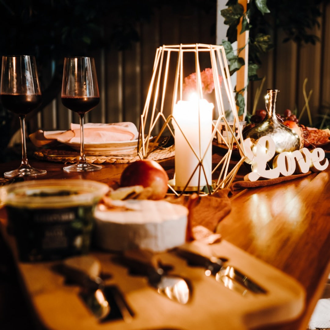 Table setting for two: Ceramic plates (white colour), gold cutlery, gold placemats, pink or grey linen napkins, Ice bucket and glassware: including wine or sparkling glasses